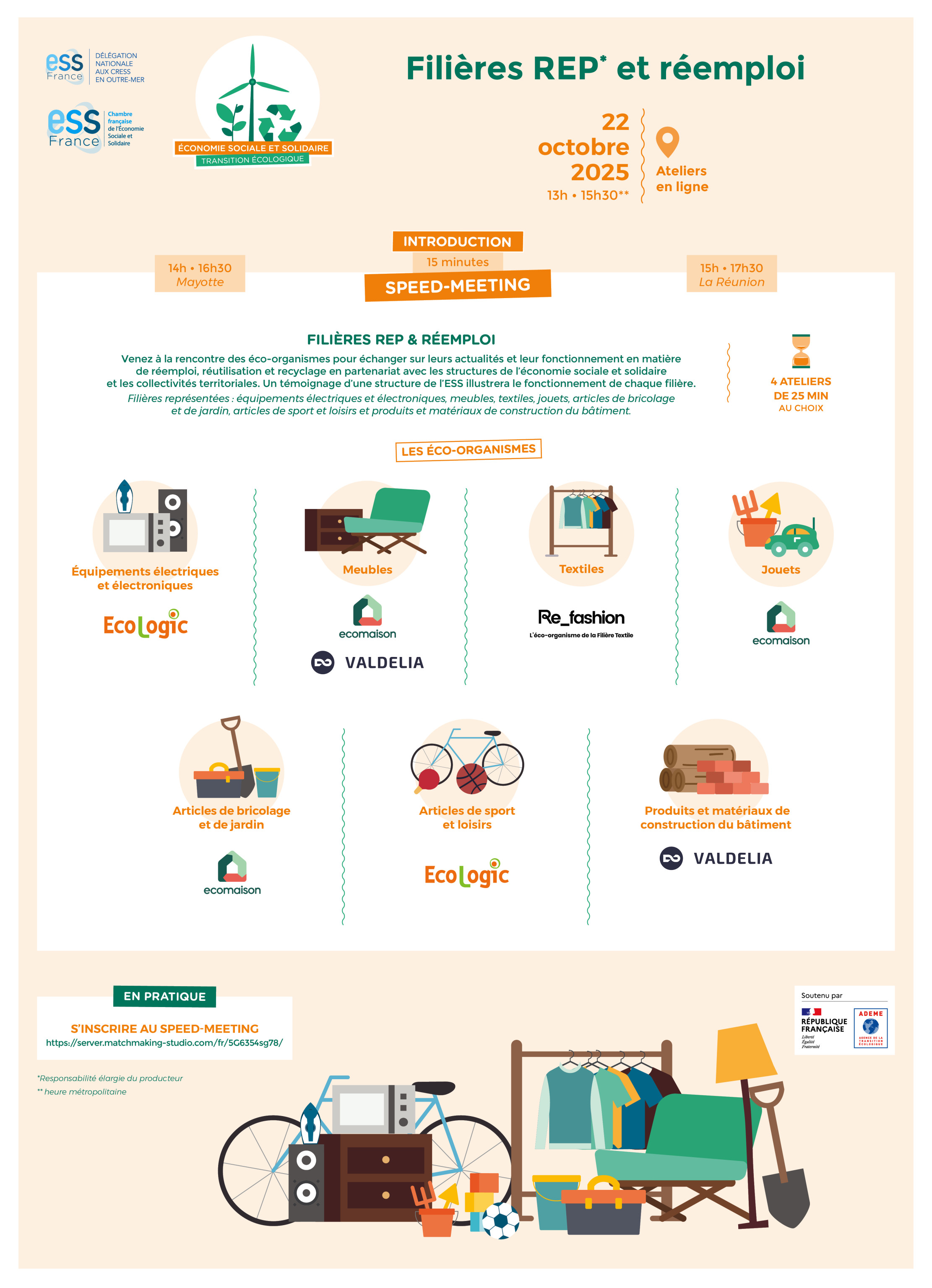 Cette année, venez à la rencontre des éco-organismes à l’occasion du Speed-meeting « Filières REP et réemploi » organisé par ESS France et les CRESS de La Réunion et de Mayotte, le 22 octobre 2025, de 13h à 15h30 (heure métropolitaine), en visioconférence.