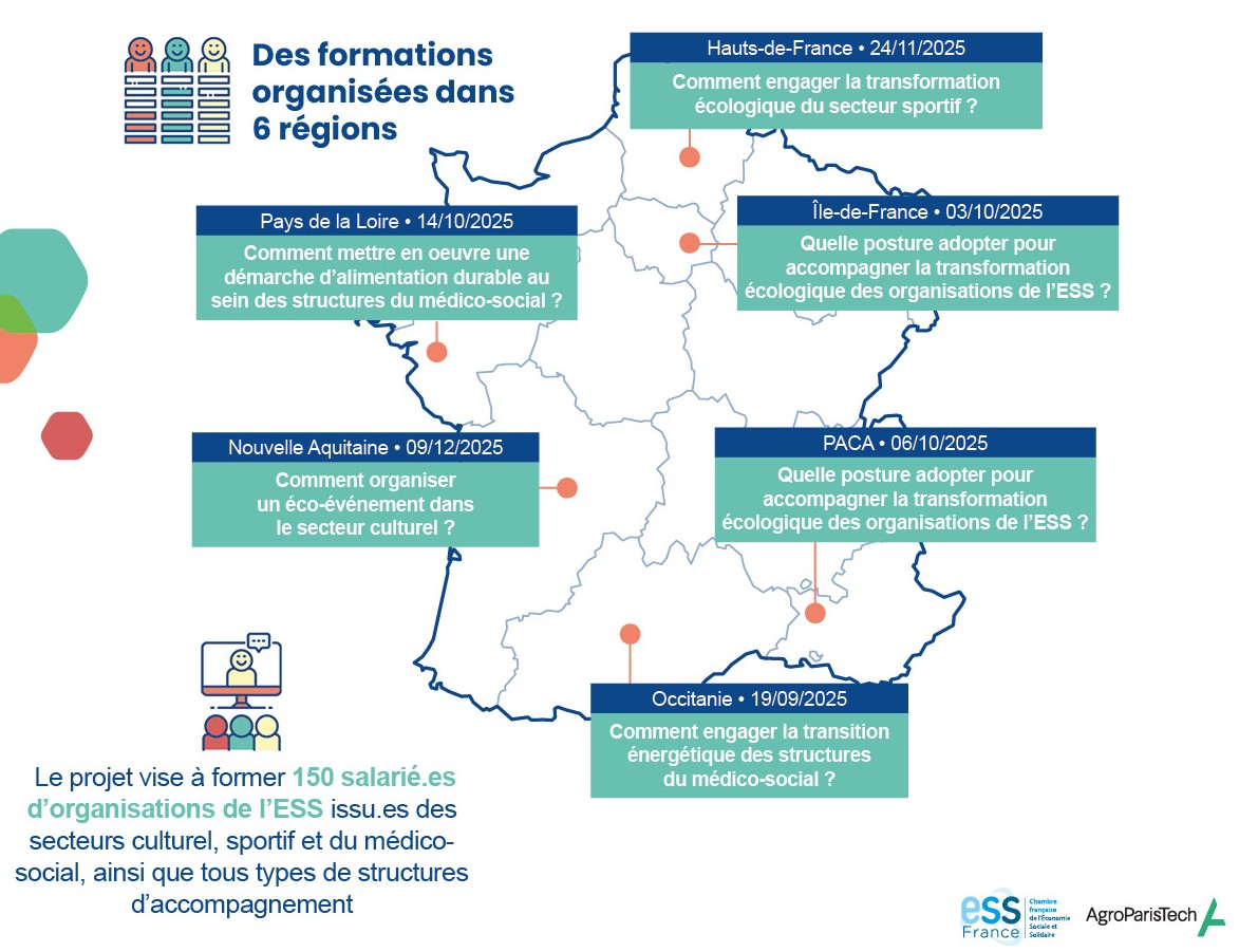 Ce projet permet le partage de connaissances entre tous les acteurs impliqués et contribue ainsi au développement de lʼécosystème. Il vise à identifier les besoins en compétences qui ne seraient pas encore adressés pour permettre la montée en compétences ou la réorientation de professionnels de l'économie sociale en ayant pour objectif de leur fournir un accès à de nouvelles compétences pour répondre aux enjeux de transition écologique, transition numérique et inclusion. Depuis octobre 2022, ESS France et AgroParisTech ont intégré ce projet pour apporter spécifiquement leur expertise sur la transition écologique.
